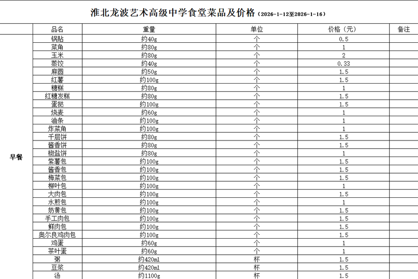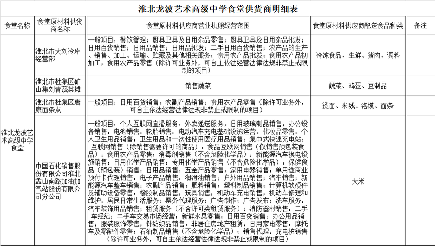 淮北龙波艺术高级中学食堂供货商及菜品明细表